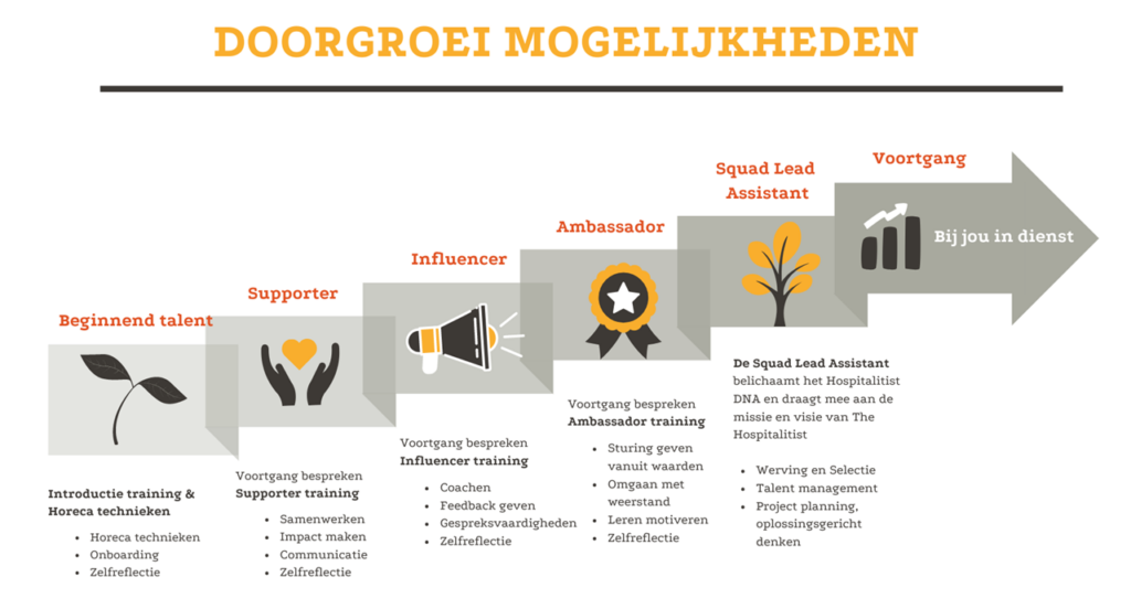 Ontwikkeling is onmisbaar voor groei en motivatie. Daarom krijgen al onze talenten een uitgebreid hospitality-leertraject, waarmee ze zich binnen drie jaar ontwikkelen van runner tot leidinggevende. Hierdoor ervaren ze meer werkplezier en halen ze betere resultaten.